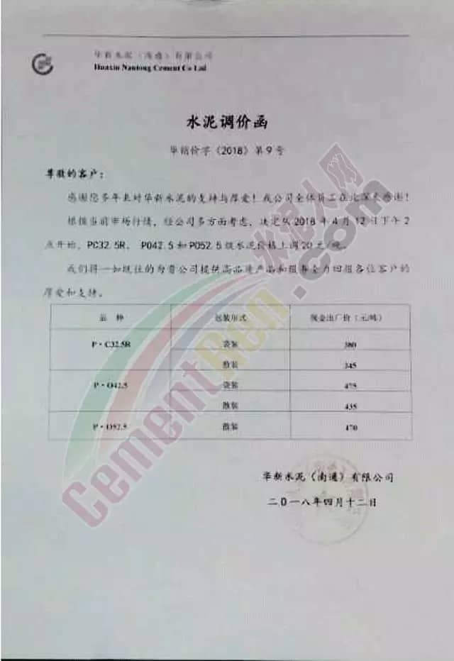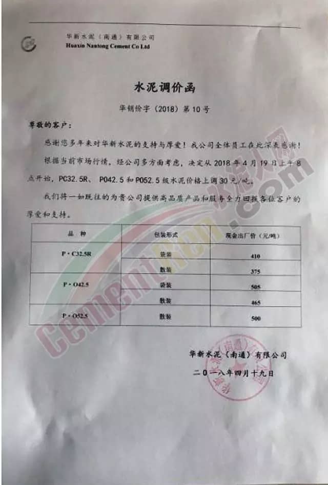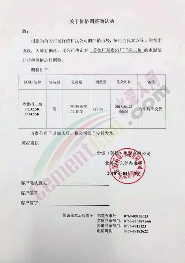 您好! 根據(jù)當(dāng)前市場(chǎng)形勢(shì)及產(chǎn)銷存情況,經(jīng)公司研究決定,我公司于2018年4月20日0:00點(diǎn)對(duì)各品種散裝水泥價(jià)格上調(diào)20元/噸。