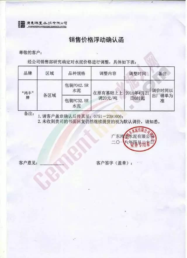廣東鴻豐水泥有限公司銷售價(jià)格浮動(dòng)確認(rèn)函稱,針對(duì)于各區(qū)域的“鴻豐”牌水泥,PO42.5R和PC32.5R包裝水泥自今日(21日)0時(shí)起上調(diào)20元/噸。調(diào)價(jià)時(shí)間以出廠磅單為準(zhǔn)。