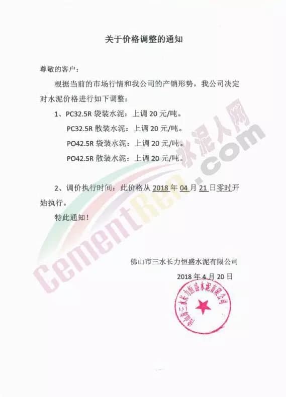 佛山市三水長(zhǎng)力恒盛水泥有限公司發(fā)布價(jià)格調(diào)整通知,通知下游客戶自今日(21日)起上調(diào)PC32.5袋/散裝和PO42.5R袋/散裝水泥價(jià)格,上調(diào)幅度20元/噸。