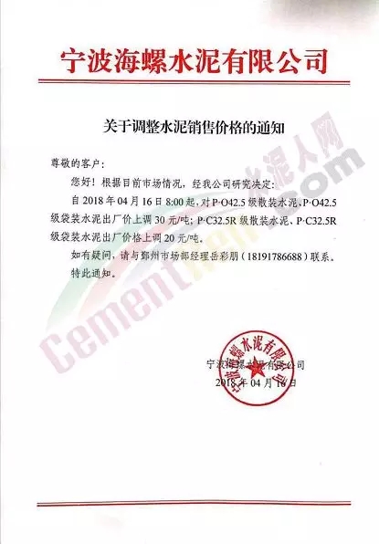 4月16日寧波區(qū)域主導(dǎo)企業(yè),通知下游客戶自早8點(diǎn)起對(duì)PO42.5級(jí)各品種水泥上調(diào)30元/噸;對(duì)P.C32.5R級(jí)各品種水泥出廠價(jià)格進(jìn)行上調(diào)20元/噸。
