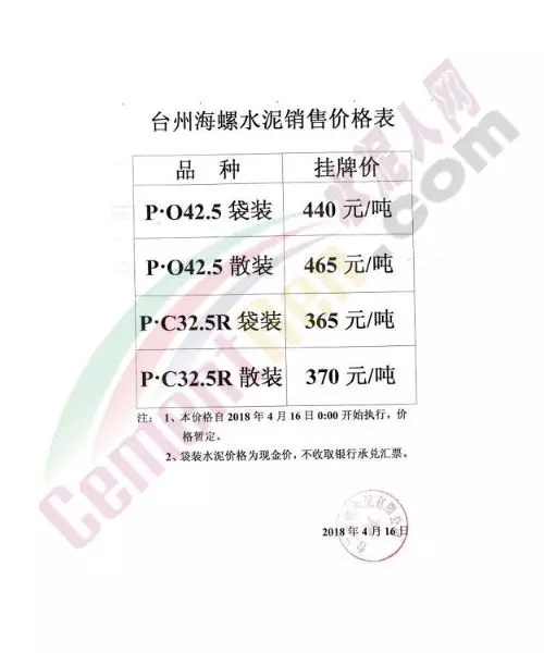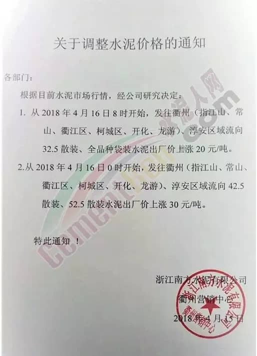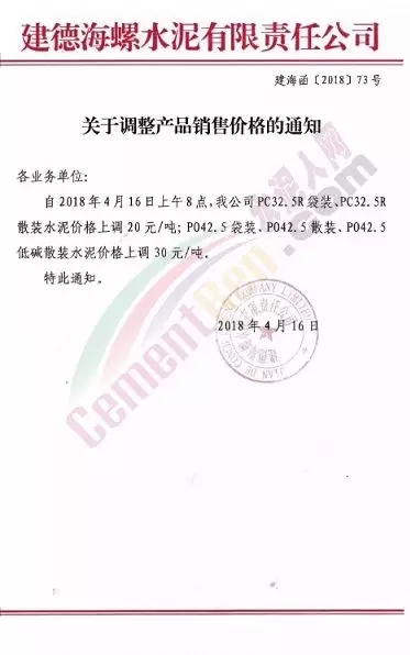 4月16日,浙江杭州區(qū)域建德海螺水泥通知下游客戶PC32.5R各品種水泥價(jià)格上調(diào)20元/噸;PO42.5各品種水泥價(jià)格上調(diào)30元/噸。