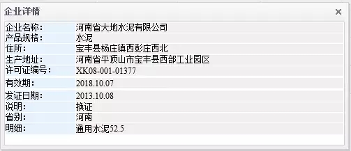 據(jù)查詢,河南省平頂山市大地水泥有限公司,生產(chǎn)地址位于河南省平頂山市寶豐縣西部工業(yè)園區(qū)。生產(chǎn)許可證編號(hào)為XK08-001-01377,生產(chǎn)許可證有效期至2018年10月7日。