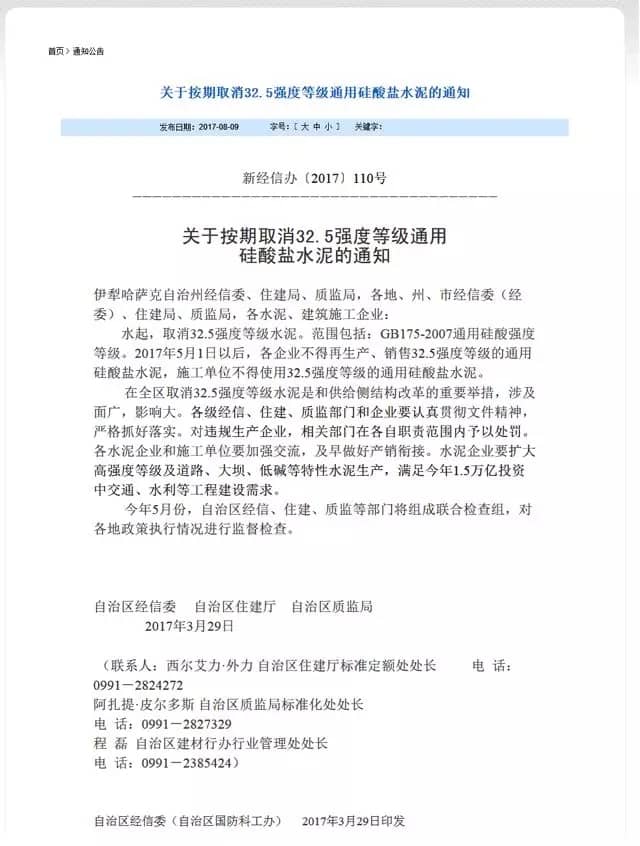 新疆自2017年5月1日起,全面停止生產(chǎn)、銷售32.5強(qiáng)度等級(jí)的通用硅酸鹽水泥,施工單位不得使用32.5強(qiáng)度等級(jí)的通用硅酸鹽水泥。