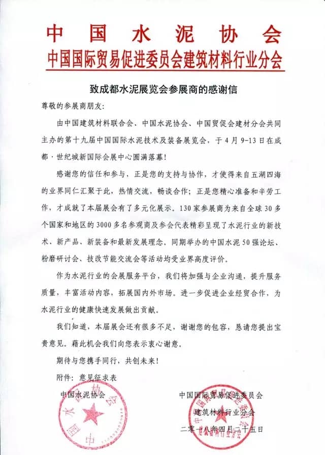 致成都水泥展覽會參展商的感謝信!