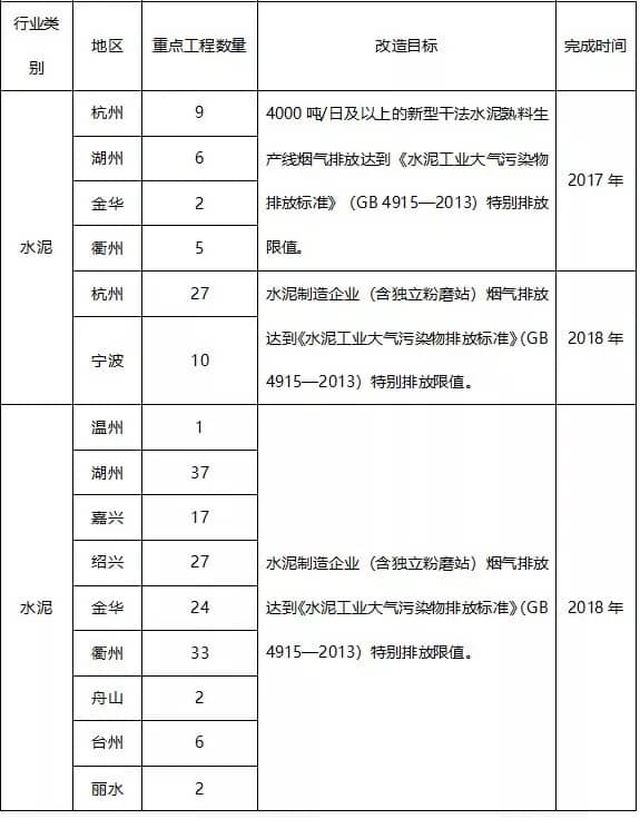 2017年3月17日浙江省發(fā)改委會(huì)同浙江省環(huán)保廳聯(lián)合印發(fā)《浙江省大氣污染防治“十三五”規(guī)劃》,規(guī)劃提出水泥行業(yè)廢氣清潔排放改造,推廣使用高效、成熟的脫硝技術(shù)和除塵技術(shù),2017年底前,規(guī)模4000噸/日及以上的新型干法水泥熟料生產(chǎn)線煙氣排放達(dá)到《水泥工業(yè)大氣污染物排放標(biāo)準(zhǔn)》(GB4915—2013)的特別排放限值要求,2018年6月30日前,所有水泥制造企業(yè)(含獨(dú)立粉磨站)廢氣排放達(dá)到特別排放限值要求。