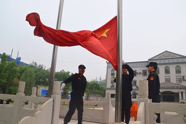 伴隨莊嚴而雄壯的國歌聲響起,全場肅立。大家個個士氣高昂、精神抖擻、昂首挺胸、深情地向國旗行注目禮,注視著五星紅旗冉冉升起,共同表達對祖國的無限忠誠以及濃濃的愛國之情。隨后大家集體宣誓公司訓(xùn)導(dǎo)詞。