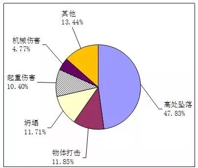 2017年,房屋市政工程生產(chǎn)安全事故按照類型劃分,高處墜落事故331起,占總數(shù)的47.83%;物體打擊事故82起,占總數(shù)的11.85%;坍塌事故81起,占總數(shù)的11.71%;起重傷害事故72起,占總數(shù)的10.40%;機(jī)械傷害事故33起,占總數(shù)的4.77%;觸電、車輛傷害、中毒和窒息、火災(zāi)和爆炸及其他類型事故93起,占總數(shù)的13.44% 。