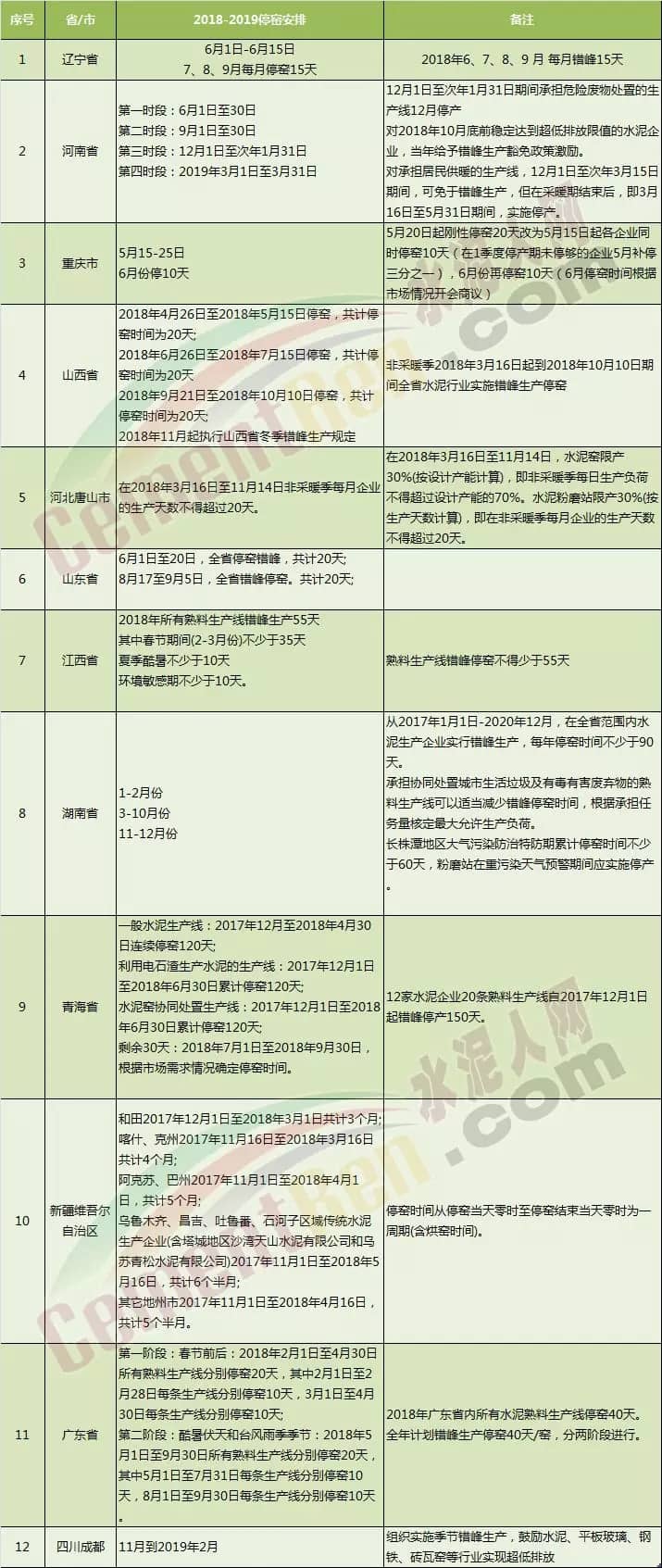 據(jù)水泥人網(wǎng)了解最近一段時(shí)間遼寧、河南、重慶等區(qū)域相繼出臺(tái)了2018年錯(cuò)峰生產(chǎn)計(jì)劃 。其停窯時(shí)間均較往年加長(zhǎng)。遼寧、甘肅等區(qū)域行業(yè)協(xié)會(huì)和主導(dǎo)企業(yè)也組織了非采暖季的錯(cuò)峰停產(chǎn)相關(guān)會(huì)議,遼寧部分地區(qū)主導(dǎo)企業(yè)計(jì)劃在5-6月份停窯限產(chǎn)30日,甘肅省內(nèi)主導(dǎo)企業(yè)于5月9日召開了錯(cuò)峰生產(chǎn)協(xié)調(diào)會(huì)議,就非采暖季錯(cuò)峰生產(chǎn)計(jì)劃做了布署。