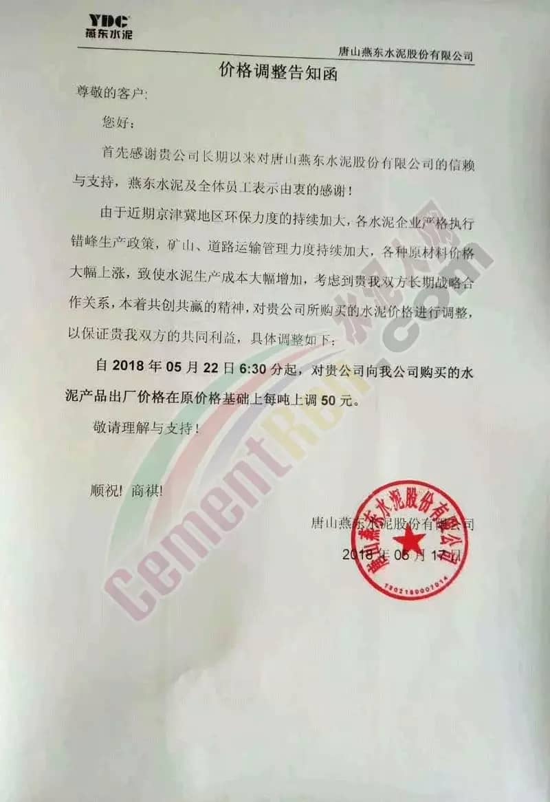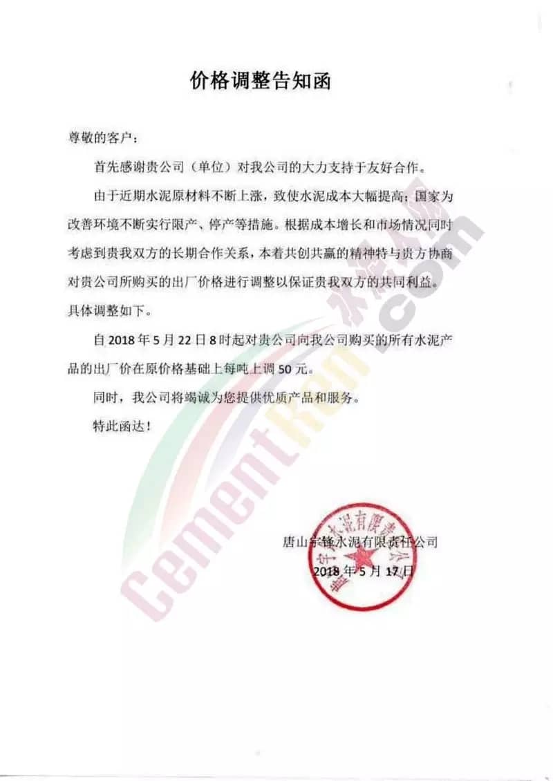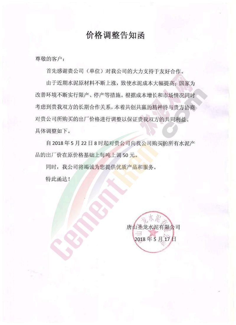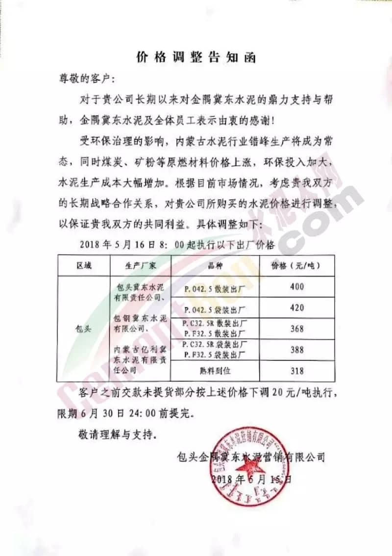 5月16日內(nèi)蒙古自治區(qū)呼和浩特市區(qū)域主導企業(yè)上調(diào)水泥價格同時包頭冀東金隅水泥也發(fā)通知上調(diào)水泥價格。