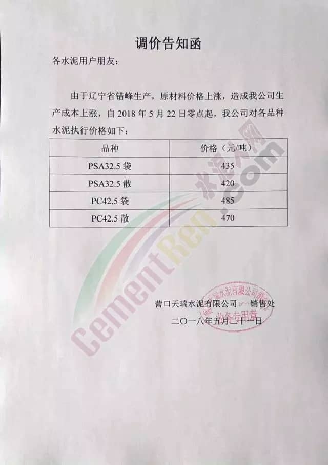 昨日下午,營口天瑞水泥發(fā)布調(diào)價告知函稱,由于遼寧省錯峰生產(chǎn),原材料價格上漲,造成公司生產(chǎn)成本上漲,自今日(22日)零點起各品種水泥執(zhí)行新價格體系。