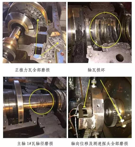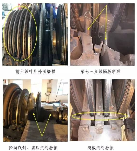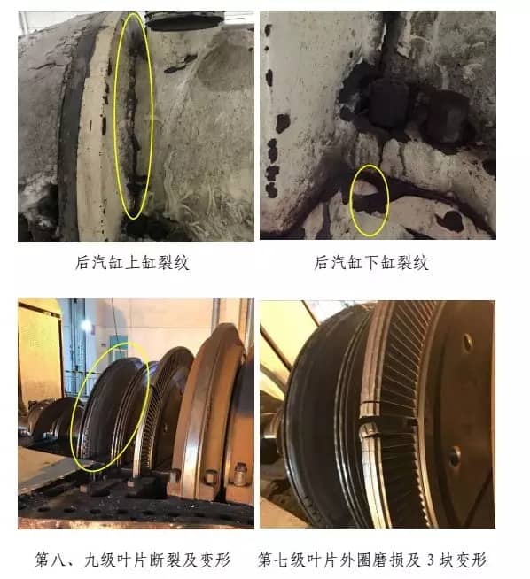 經(jīng)檢查,汽輪機(jī)后缸上、下缸體開(kāi)裂,第八、九級(jí)葉片全部脫落,第七級(jí)葉片外圈磨損及 3塊變形,前六級(jí)葉片外圈磨損,第七~九級(jí)隔板斷裂,隔板汽封、徑向汽封、前后汽封全部磨損,主油泵小軸斷裂及油封環(huán)磨損,主油泵擋油環(huán)斷裂,正推力瓦全部磨損,1#~4#瓦損壞,主軸1#、2#瓦軸徑磨損,軸向位移及測(cè)速探頭全部磨損,汽輪機(jī)側(cè)聯(lián)軸器及齒輪位移,盤(pán)車電機(jī)殼體斷裂,勵(lì)磁機(jī)定轉(zhuǎn)子摩擦損壞,整流盤(pán)連接線斷裂及風(fēng)扇葉片磨損,凝汽器約20根銅管受損,發(fā)電機(jī)轉(zhuǎn)子需返廠檢修測(cè)試。