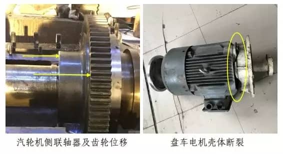 22:40分,公司領(lǐng)導(dǎo)到達(dá)現(xiàn)場(chǎng),組織人員對(duì)現(xiàn)場(chǎng)采取保護(hù)和應(yīng)急處置。恢復(fù)供電后,對(duì) 1#機(jī)組進(jìn)行了初步檢查,發(fā)現(xiàn)排氣缸開(kāi)裂,安全閥沖開(kāi),勵(lì)磁機(jī)端蓋脫落,手動(dòng)盤(pán)車無(wú)法盤(pán)動(dòng)等。在安排專人現(xiàn)場(chǎng)監(jiān)控后向區(qū)域?qū)I(yè)組領(lǐng)導(dǎo)、股份公司相關(guān)部室人員進(jìn)行了匯報(bào)。