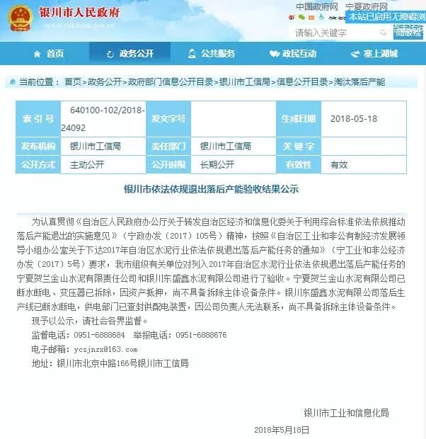 【水泥人網(wǎng)】日前,銀川市工業(yè)和信息化局發(fā)布了《銀川市依法依規(guī)退出落后產(chǎn)能驗收結(jié)果公示》,公示稱為認(rèn)真貫徹《自治區(qū)人民政府辦公廳關(guān)于轉(zhuǎn)發(fā)自治區(qū)經(jīng)濟(jì)和信息化委關(guān)于利用綜合標(biāo)準(zhǔn)依法依規(guī)推動落后產(chǎn)能退出的實施意見》(寧政辦發(fā)〔2017〕105號)精神,按照《自治區(qū)工業(yè)和非公有制經(jīng)濟(jì)發(fā)展領(lǐng)導(dǎo)小組辦公室關(guān)于下達(dá)2017年自治區(qū)水泥行業(yè)依法依規(guī)退出落后產(chǎn)能任務(wù)的通知》(寧工業(yè)和非公經(jīng)濟(jì)辦發(fā)〔2017〕5號)要求,銀川市組織有關(guān)單位對列入2017年自治區(qū)水泥行業(yè)依法依規(guī)退出落后產(chǎn)能任務(wù)的寧夏賀蘭金山水泥有限責(zé)任公司和銀川東盛鑫水泥有限公司進(jìn)行了驗收。