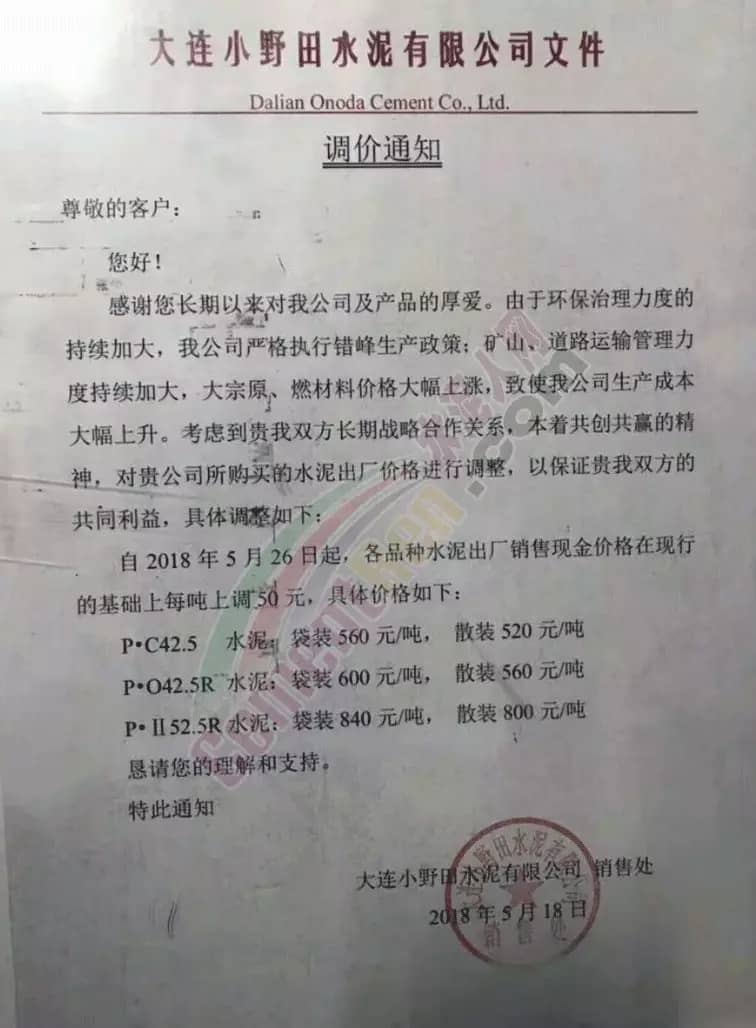 【水泥人網(wǎng)】日前,大連小野田水泥有限公司銷售處發(fā)布調(diào)價通知稱,由于環(huán)保治理力度的持續(xù)大加,公司嚴(yán)格執(zhí)行錯峰生產(chǎn)政策;礦山、道路運輸管理力度持續(xù)加大,大宗原、燃材料價格大幅上漲,致使公司生產(chǎn)成本大幅上升。為保證企業(yè)與用戶的共同利益,將水泥價格上調(diào)。其中P.II52.5R標(biāo)號袋裝水泥執(zhí)行價格調(diào)為840元/噸。