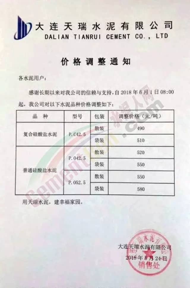 水泥人網(wǎng)信息中心數(shù)據(jù)顯示,同區(qū)域的大連天瑞水泥于5月24日發(fā)布了價格調(diào)整通知,通知稱自6月1日8點起,水泥銷售執(zhí)行新的價格體系。
