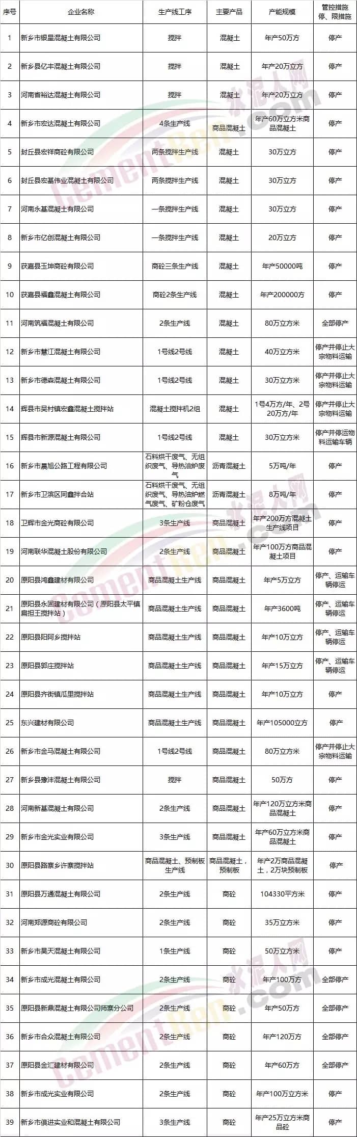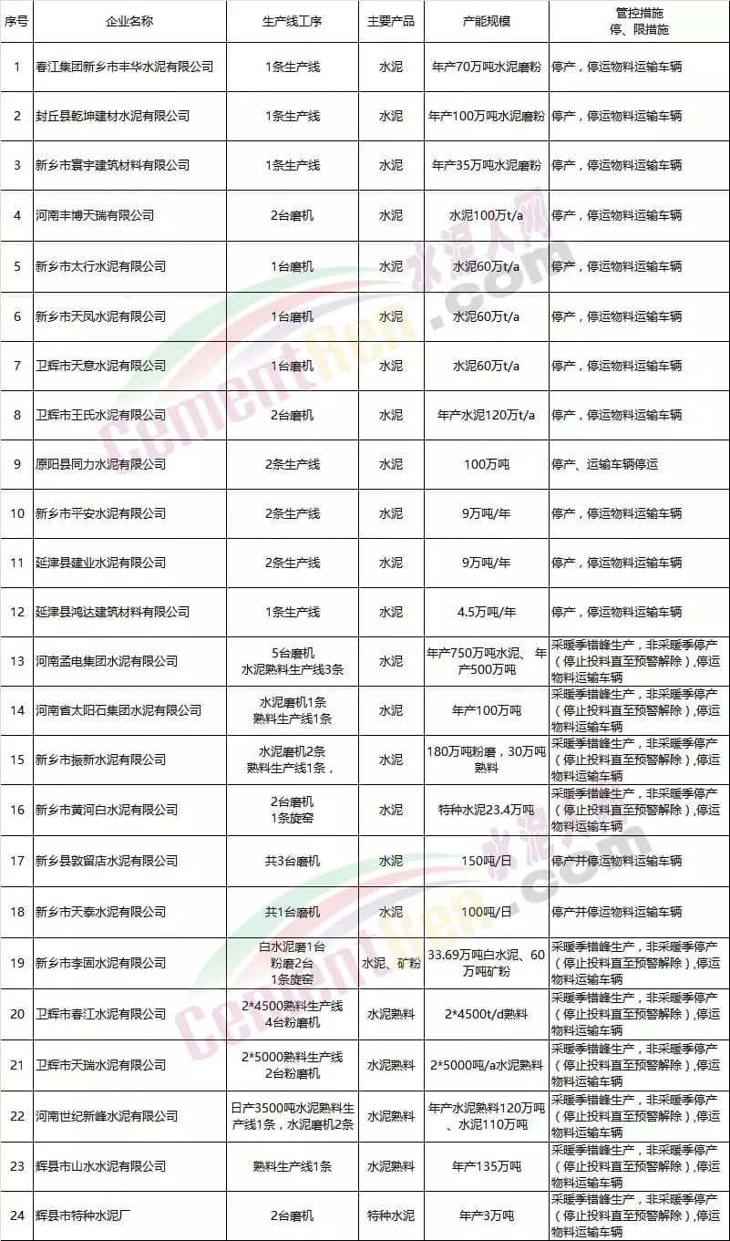 水泥、熟料、混凝土等企業(yè)管控清單