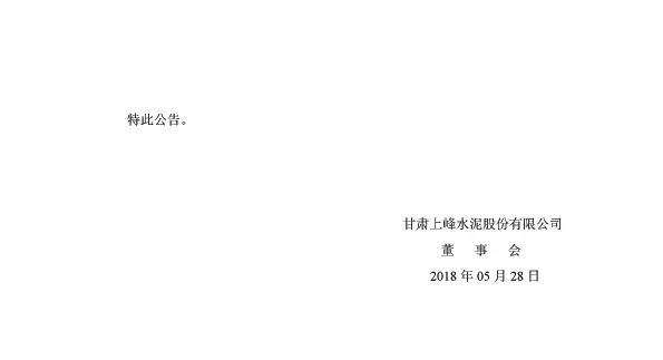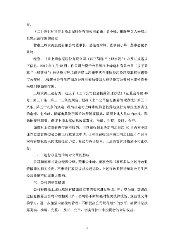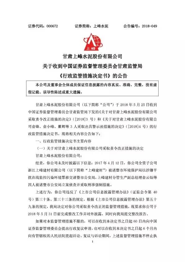 【水泥人網(wǎng)】上峰水泥28日早間公告,公司于5月25日收到中國證券監(jiān)督管理委員會甘肅監(jiān)管局下發(fā)的《關于對甘肅上峰水泥股份有限公司采取責令改正措施的決定》([2018]3號)和《關于對甘肅上峰水泥股份有限公司俞鋒、俞小峰、瞿輝等3人采取出具警示函措施的決定》([2018]4號)的行政監(jiān)管措施決定書。