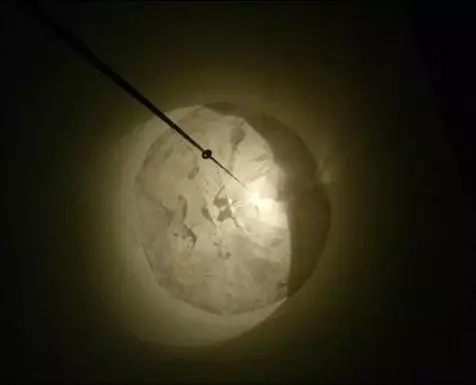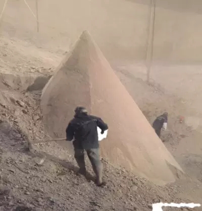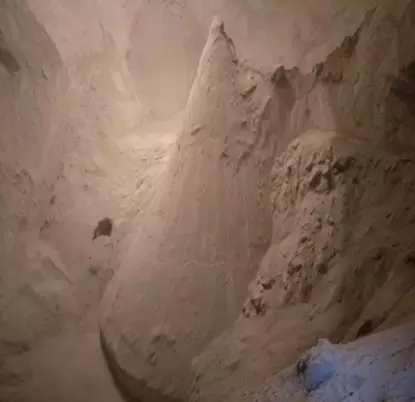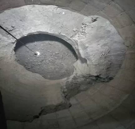 2018年元月,徹底拆除原混凝土減壓錐(如圖五),改換為粉流掣的太極錐后,開(kāi)始按5米料位2000噸水泥,9米料位4000噸水泥,直至滿庫(kù)1萬(wàn)噸水泥,逐步展開(kāi)試機(jī)生產(chǎn),結(jié)果完全達(dá)到預(yù)期目標(biāo)(如圖六);正常運(yùn)行2月后,于3月又再次進(jìn)行滿庫(kù)放空驗(yàn)證,事實(shí)證明(如圖七)。粉流掣一直以自然整體流卸放,使環(huán)庫(kù)壁硬料永遠(yuǎn)處于動(dòng)態(tài)自動(dòng)更新?tīng)顟B(tài),而且巨大的料壓作用于庫(kù)壁的清理效果非常光滑干凈,真正達(dá)到了邊運(yùn)行卸放邊自動(dòng)清庫(kù)的理想狀況。最后自然放空的尾料很少,空深達(dá)37米,四周自然堆積余料高度范圍完全符合理論描述。