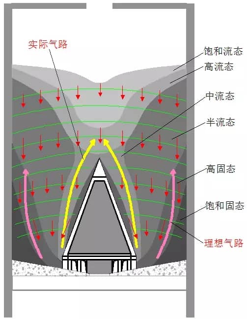顯然,由于氣動(dòng)方式存在嚴(yán)重的氣路自然偏析極化本性,與庫(kù)內(nèi)料壓自然形成的重力拱作用造成的壁硬中軟密度分布完全不匹配。無(wú)論庫(kù)底氣槽陣列設(shè)計(jì)再均衡,也改變不了其必然形成邊壁死料不斷增長(zhǎng)的趨勢(shì);可以說(shuō),現(xiàn)行氣動(dòng)技術(shù)方案本質(zhì)上就存在嚴(yán)重的癌變基因,其自動(dòng)形成大量死料偏庫(kù)現(xiàn)象實(shí)際就是無(wú)效腫瘤組織不斷自我激發(fā)生長(zhǎng)惡化的必然結(jié)果。