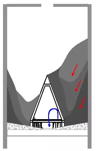 經(jīng)過(guò)認(rèn)真研究發(fā)現(xiàn),粉體在庫(kù)內(nèi)的實(shí)際力學(xué)傳導(dǎo)分布,存在類似電流在導(dǎo)體上的集膚效應(yīng)。粉體在庫(kù)內(nèi)因重力壓迫橫向膨脹,會(huì)形成平行多層弱穩(wěn)定拱架,也稱為重力拱。它的存在將每層料重沿自然大弧形拱橋橫傳至庫(kù)壁,最后形成垂直疊加支撐平衡,形成空心化重力庫(kù)壁外聚作用;而遠(yuǎn)非我們想象的均勻重力分布作用,因而易產(chǎn)生硬固性掛壁滯留效應(yīng)。
