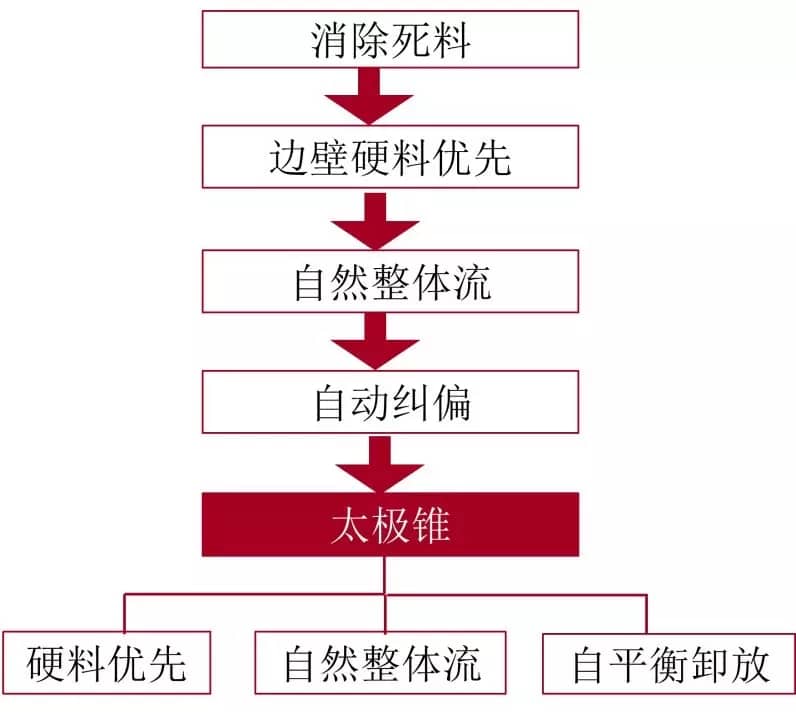 如果能讓邊壁的硬固料優(yōu)先從庫(kù)底同時(shí)產(chǎn)生流出運(yùn)動(dòng),產(chǎn)生環(huán)庫(kù)壁的整體自然平衡流動(dòng),造成全庫(kù)活料運(yùn)行的局面,就可以從根本消除死料的存在和生長(zhǎng);不但可以大幅度的從根本性提升庫(kù)容使用效率,還能最終徹底擺脫清庫(kù)的必要和相應(yīng)的巨大代價(jià)。