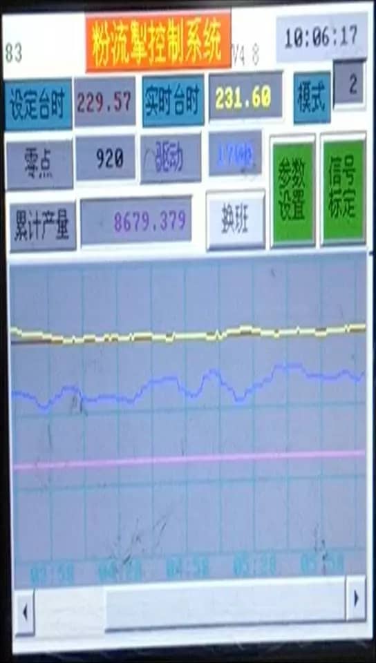 我們發(fā)現(xiàn),庫(kù)底出口存在的收縮拱是造成粉體順利卸出的關(guān)鍵障礙,從而精巧發(fā)明設(shè)計(jì)出無(wú)動(dòng)力太極錐裝置。該裝置充分利用庫(kù)內(nèi)粉體料重高位勢(shì)能為原動(dòng)力,通過(guò)置于庫(kù)內(nèi)出口上方的太極錐針對(duì)性鋼結(jié)構(gòu)設(shè)計(jì),形成了自然剪切力破解粉體收縮運(yùn)動(dòng)的拱阻作用;并確保形成最底層硬固料優(yōu)先卸除的自動(dòng)平衡安排,使庫(kù)內(nèi)千百噸粉料重力勢(shì)能形成前拉后推的整體作用于庫(kù)壁,實(shí)現(xiàn)了無(wú)動(dòng)力無(wú)死區(qū)自然整體流卸料;而且其力學(xué)分布作用與庫(kù)壁密度分布正好形成自動(dòng)糾偏的平衡反饋機(jī)制,最終達(dá)成大庫(kù)邊運(yùn)行卸放邊自我清理庫(kù)壁的理想作用(如圖三)。即便庫(kù)頂因雨天產(chǎn)生少量滲漏,也會(huì)被流動(dòng)性粉料迅速消化移除,徹底排除死料形成及其惡性生長(zhǎng)的溫床。由于無(wú)需吹入空氣,不但大幅節(jié)能降噪,半流動(dòng)性還有利于后續(xù)機(jī)械實(shí)現(xiàn)流量自適應(yīng)穩(wěn)定卸放控制。同時(shí),針對(duì)不同庫(kù)位等復(fù)雜工況配套設(shè)計(jì)了專用卸料裝置和高精度沖板流量計(jì),以及量身定制的智能反饋電腦控制驅(qū)動(dòng)系統(tǒng),構(gòu)成了完整的綠色智能水泥卸放閉環(huán)控制系統(tǒng)粉流掣,能接入中控進(jìn)行數(shù)字遠(yuǎn)程定量控制卸放(如圖四)。