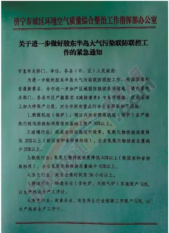 據(jù)水泥人網(wǎng)通訊員消息:6月2日濟寧市城區(qū)環(huán)境空氣質(zhì)量綜合整治工作指揮部辦公室發(fā)布《關(guān)于進一步做好膠東半島大氣污染聯(lián)防聯(lián)控工作的緊急通知》。通知稱:為進一步做好膠東半島大氣污染聯(lián)防聯(lián)控工作,根據(jù)國家和省最新要求,全市進一步加嚴區(qū)域聯(lián)防聯(lián)控各項措施。要求濟寧市直有關(guān)部門、各省市區(qū)嚴格落實《減排清單》中各項措施,并在此基礎上加大停限產(chǎn)力度,對全市所有重點行業(yè)企業(yè)采取措施。