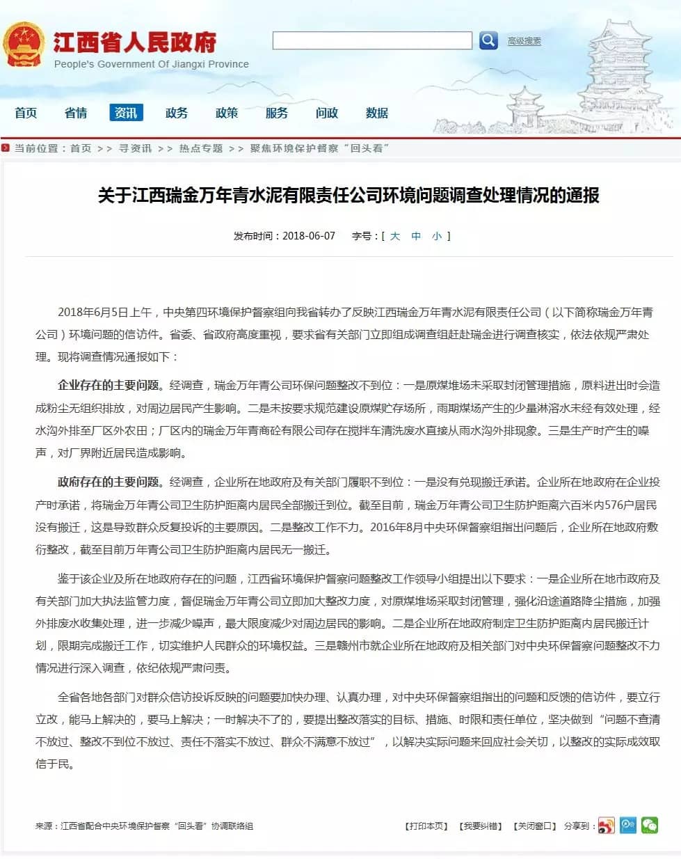 經(jīng)調(diào)查,瑞金萬年青公司環(huán)保問題整改不到位: