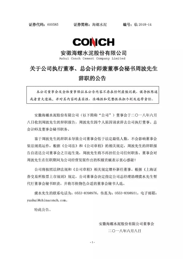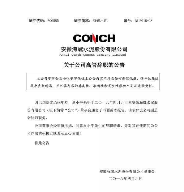 據(jù)了解,今年4月9日海螺水泥公司副總會(huì)計(jì)師夏小平先生因已到法定退休年齡于2018年4月9日向安徽海螺水泥股份有限公司董事會(huì)遞交了書(shū)面辭職報(bào)告,請(qǐng)求辭去公司副總會(huì)計(jì)師職務(wù)。公司董事會(huì)經(jīng)審慎考慮,同意夏小平先生的辭職請(qǐng)求,并對(duì)其在任期間為公司作出的積極貢獻(xiàn)表示了衷心感謝!