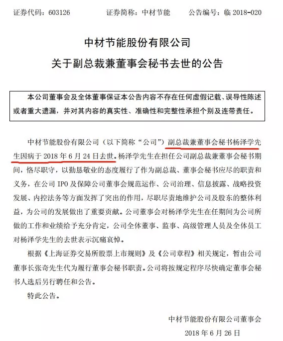 中材節(jié)能(603126)6月25日晚間公布,公司副總裁兼董秘楊澤學(xué)因病于2018年6月24日去世,暫由公司董事長張奇代為履行董秘職責(zé)。