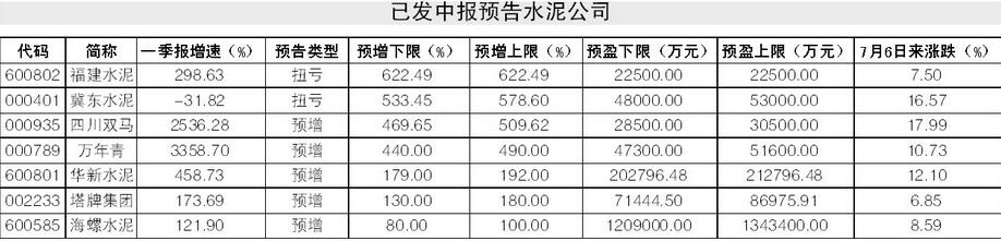 而據(jù)Wind統(tǒng)計顯示,申萬水泥行業(yè)18家水泥A股公司中,7家已發(fā)中報預告,全部預增或扭虧,預增下限最低的也有80%,其余6家超過100%,數(shù)倍增長公司過半。