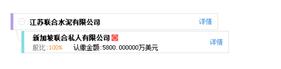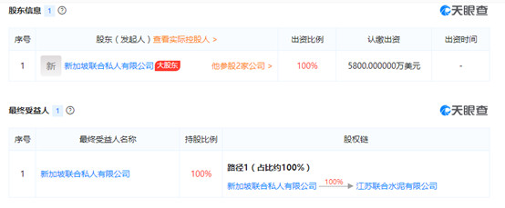 天眼查數(shù)據(jù)顯示,新加坡聯(lián)合私人有限公司為江蘇聯(lián)合水泥有限公司最大股東,股比100%,或為直接控股方。