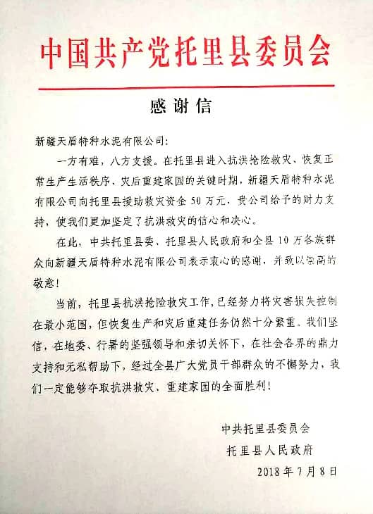 為此,中共托里縣委員會、托里縣人民政府特發(fā)函致謝,對天盾特種水泥公司在本次抗洪搶救災(zāi)過程中所做的貢獻,縣委相關(guān)領(lǐng)導(dǎo)對于天盾水泥能夠從大局出發(fā),不計企業(yè)得失的大局觀給予了高度的評價和認可。