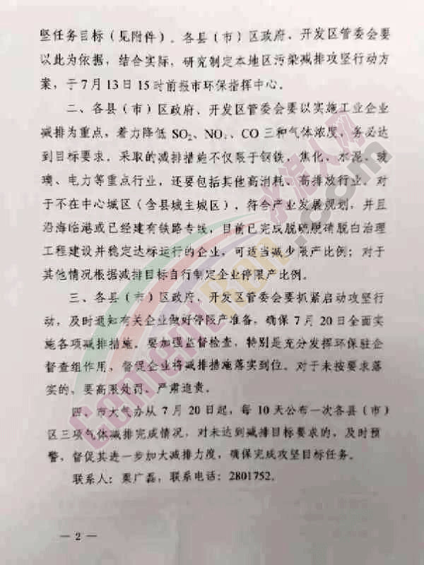 二、各縣(市)區(qū)政府、開發(fā)區(qū)管委會要以實施工業(yè)企業(yè)減排為重點,著力降低SO?、NO?、CO三種氣體濃度,務(wù)必達到目標要求,采取的減排措施不僅限于鋼鐵、焦化、水泥、玻璃、電力等重點行業(yè),還要包括其他高能耗、高排放行業(yè)。對于不在中心城區(qū)(含縣城主城區(qū)),符合產(chǎn)業(yè)發(fā)展規(guī)劃,并且沿海臨港或已經(jīng)建有鐵路專線,目前已完成脫硫脫硝脫白治理工程建設(shè)并穩(wěn)定達標運行的企業(yè),可適當減少限產(chǎn)比例;對于其他情況根據(jù)減排目標自行制定企業(yè)停限產(chǎn)比例。