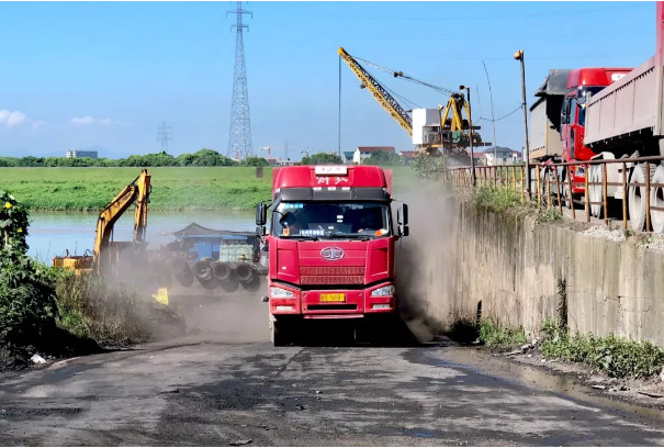在費龍口村督查時,督查人員發(fā)現(xiàn)金華江沿岸有兩座碼頭,分別用于煤炭、砂石裝卸運輸,大貨車出入頻繁,現(xiàn)場道路布滿灰塵煤渣,車輛駛過揚塵明顯,場地上煤炭、沙石隨意堆放,無任何防塵措施。督查組現(xiàn)場盤問了相關(guān)情況,對存在問題進行記錄,并拍攝了揚塵實況。