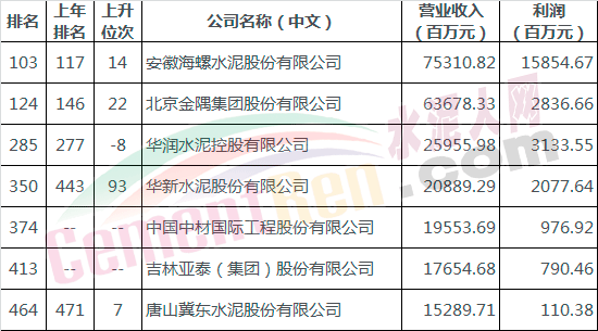 今年落榜的兩家為中國建材和葛洲壩集團(tuán),新上榜企業(yè)為中材國際和吉林亞泰集團(tuán)。今年上榜的企業(yè)多數(shù)較上年排名有所提前。其中海螺水泥從117名上升至103名,上升了14個(gè)名次,位于水泥板塊第一位。以此速度明年渴望入圍百名之內(nèi)。上升名次最快的屬華新水泥,一躍升至第350位,躍位近百名。唯一遺憾的華潤水泥自277名落至285名。