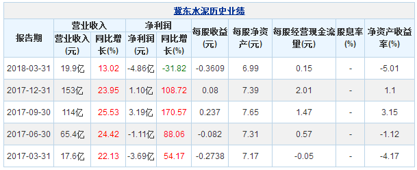 冀東水泥4月20日最新公布的2018年一季報(bào)顯示,其營業(yè)收入19.9億元,同比增長13.02%;歸屬于上市公司股東的凈利潤-4.86億元,同比下降31.82%。