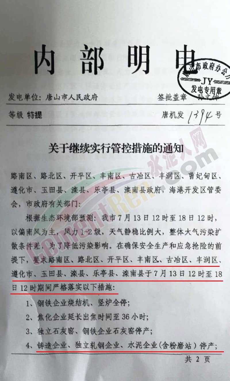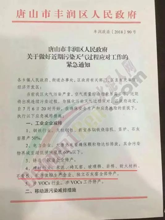此次唐山市政府為何發(fā)出如此嚴(yán)厲的文件,不得不從前幾日的停產(chǎn)文件說起,7月6日唐山市豐潤(rùn)區(qū)人民政府發(fā)布關(guān)于做好近期污染天氣過程應(yīng)對(duì)工作的緊急通知,要求豐潤(rùn)區(qū)所屬水泥企業(yè)全部停產(chǎn)(文件如下):