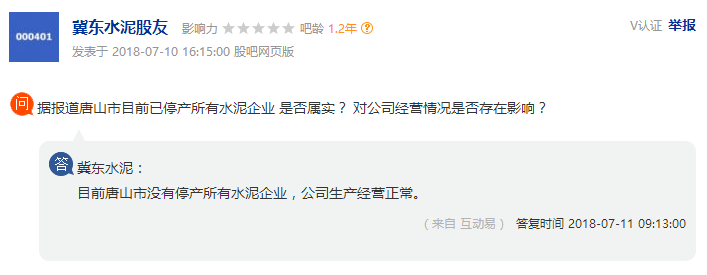 可是在文件發(fā)出以后,豐潤(rùn)區(qū)的水泥龍頭企業(yè)冀東竟然在投資者平臺(tái)上回應(yīng):唐山市沒有停產(chǎn)所有水泥企業(yè),公司生產(chǎn)經(jīng)營(yíng)一切正常。
