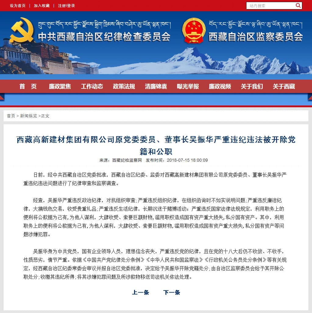 依據(jù)《中國共產(chǎn)黨紀(jì)律處分條例》《中華人民共和國監(jiān)察法》《行政機(jī)關(guān)公務(wù)員處分條例》等有關(guān)規(guī)定,經(jīng)西藏自治區(qū)紀(jì)委常委會審議并報(bào)自治區(qū)黨委批準(zhǔn),決定給予吳振華開除黨籍處分;由自治區(qū)監(jiān)察委員會給予其開除公職處分;收繳其違紀(jì)所得;將其涉嫌犯罪問題及所涉款物移送司法機(jī)關(guān)依法處理。