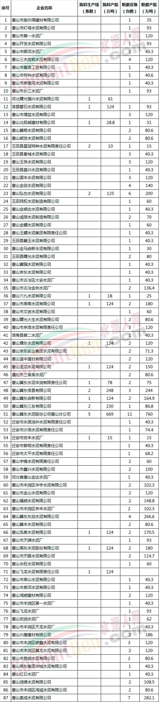 唐山市水泥企業(yè)名單