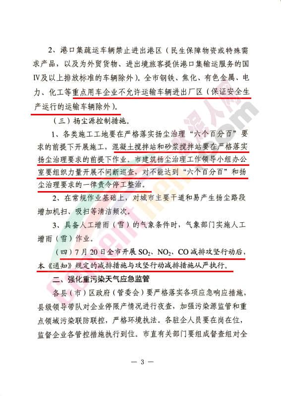 各類施工工地要在嚴格落實揚塵治理“六個百分百”要求的提前下開展施工,混凝土攪拌站和砂漿攪拌站要在嚴格落實揚塵治理要求的前提下作業(yè)。市建筑揚塵治理工作領導小組辦公室要組織開展力量開展不間斷巡查,對不能達到“六個百分百”和揚塵治理要求的一律責令停工整治;7月20日全市開展SO?、NO?、CO減排攻堅行動后,本《通知》規(guī)定的減排措施與攻堅行動減排措施從嚴執(zhí)行。