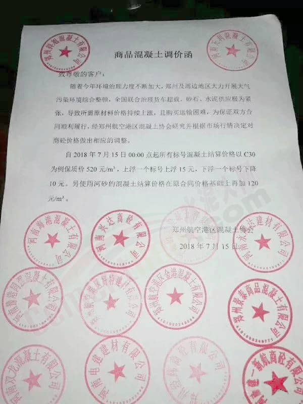 日前,鄭州航空港區(qū)混凝土協(xié)會十四家商混企業(yè)集體發(fā)布商品混凝土調(diào)價函稱,隨著今年環(huán)境治理力度不斷加大,鄭州及周邊地區(qū)大力開展大氣污染環(huán)境綜合整頓,全國聯(lián)合治理貨車超載,砂石、水泥供應(yīng)極為緊張,導(dǎo)致所需原材料價格持續(xù)上漲,且購買運(yùn)輸困難,為保證雙方合同順利履行,經(jīng)鄭州航空港區(qū)混凝土協(xié)會研究并根據(jù)市場行情決定對商砼價格做出相應(yīng)的調(diào)整。