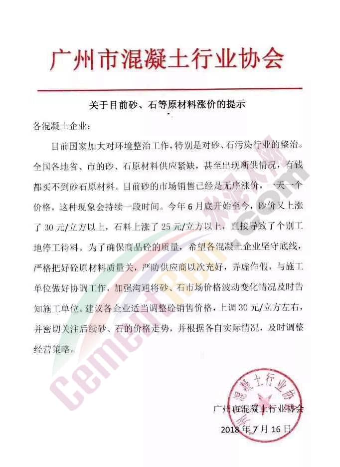 廣州、深圳混凝土協(xié)會相繼發(fā)出調(diào)價提示函