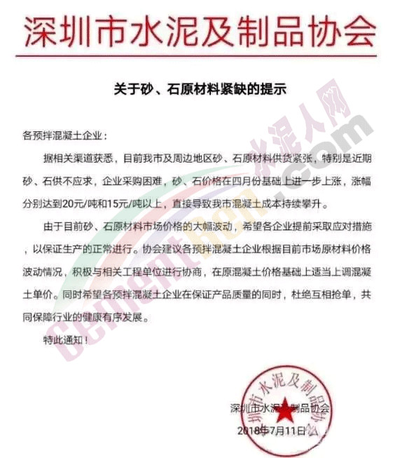 7月11日深圳水泥及制品協(xié)會發(fā)布關(guān)于砂、石原材料緊缺的提示,提示稱據(jù)相關(guān)渠道獲悉,深圳及周邊地區(qū)砂、石原材料供貨緊張,特別是近期砂、石供不應(yīng)求,企業(yè)采購困難,砂、石價格在四月份基礎(chǔ)上進(jìn)一步上漲,漲幅分別達(dá)到20元/噸和15元/噸以上,直接導(dǎo)致深圳市混凝土成本持續(xù)攀升。由于目前砂、石原材料市場價格的大幅波動,協(xié)會希望各企業(yè)提前采取對應(yīng)措施,以保證生產(chǎn)的正常進(jìn)行。協(xié)會建議各預(yù)拌混凝土企業(yè)根據(jù)目前市場原材料價格波動情況,積極與相關(guān)工程單位進(jìn)行協(xié)商,在原混凝土價格基礎(chǔ)上適當(dāng)上調(diào)混凝土單價。希望各預(yù)拌混凝土企業(yè)在保證產(chǎn)品質(zhì)量的同時,杜絕互相搶單,共同保障行業(yè)的健康有序發(fā)展。
