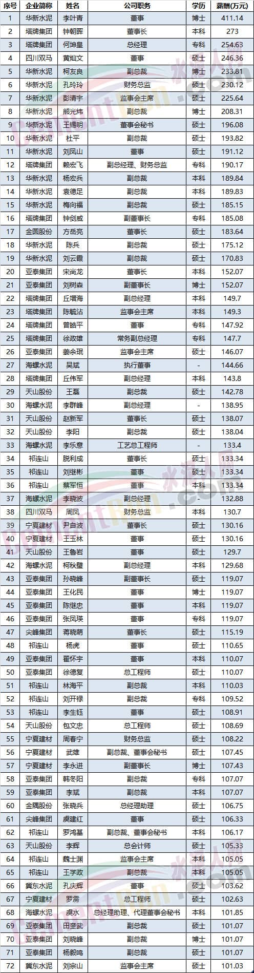 上市公司數(shù)據(jù)庫數(shù)據(jù)顯示,截止2018年7月18日七十二位上市企業(yè)高管年薪逾百萬。其中華新水泥總裁董事長年薪超400萬。此前一直被稱為水泥行業(yè)上市公司“巨虧“的冀東水泥高管監(jiān)事會主席劉宗山年薪亦過百萬。
