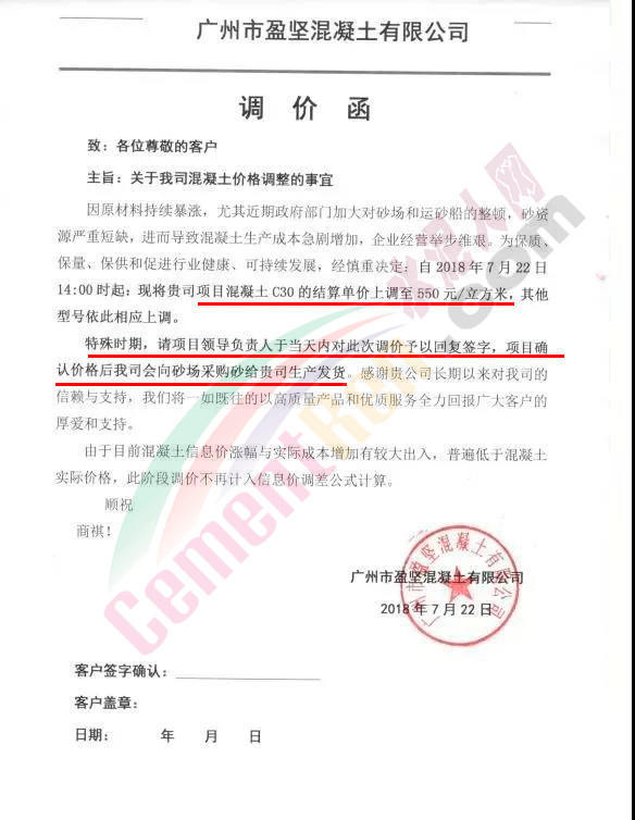 廣州市盈堅(jiān)混凝土有限公司調(diào)價(jià)函稱,因原材料持續(xù)暴漲,尤其近期政府部門加大對(duì)砂場和運(yùn)砂船的整頓,砂資源嚴(yán)重短缺,進(jìn)而導(dǎo)致混凝土生產(chǎn)成本急劇增加,企業(yè)經(jīng)營舉步維艱。為保質(zhì)、保量、保供和促進(jìn)行業(yè)健康、可持續(xù)發(fā)展,經(jīng)慎重決定:自2018年7月22日14時(shí)起將混凝土C30的結(jié)算單價(jià)上調(diào)至550元/立方米,其他型號(hào)依此相應(yīng)上調(diào)。