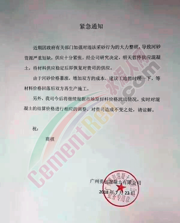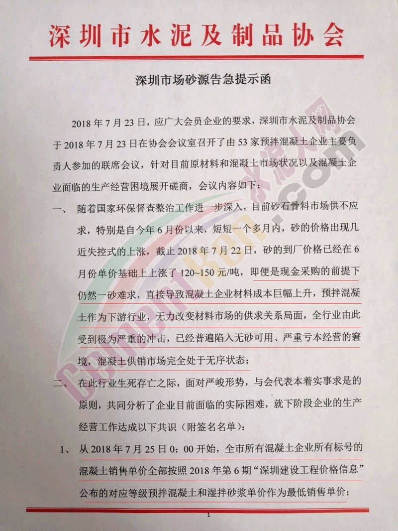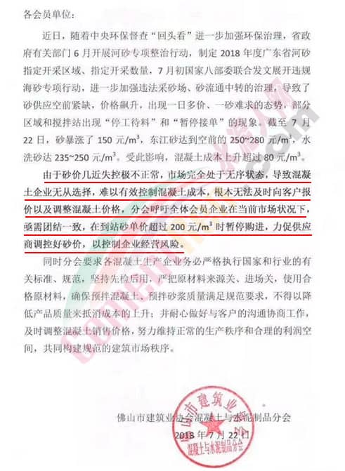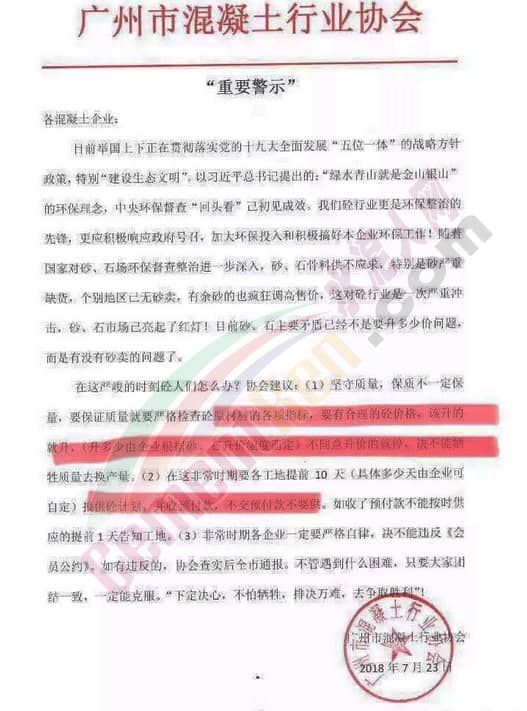 廣州市混凝土行業(yè)協(xié)會(huì)發(fā)布“重要警示”稱,隨著國家對(duì)砂、石場(chǎng)環(huán)保督查整治進(jìn)一步深入,砂、石骨料供不應(yīng)求,特別是砂嚴(yán)重缺貨,個(gè)別地區(qū)已經(jīng)無砂可賣,有余砂的也瘋狂調(diào)高售價(jià),這對(duì)砼行業(yè)是一次嚴(yán)重沖擊,砂石市場(chǎng)已亮起了紅燈!目前砂、石主要矛盾已經(jīng)不是升多少價(jià)問題了,而是有沒有砂賣的問題了。