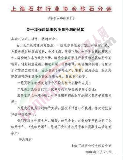 近日,上海市混凝土行業(yè)協(xié)會(huì)發(fā)布緊急通知,要求各預(yù)拌混凝土生產(chǎn)企業(yè)、預(yù)拌砂漿企業(yè)加大用砂的氯離子含量檢測(cè)力度,禁止使用海砂用于生產(chǎn)。要求全市所有預(yù)拌混凝土生產(chǎn)企業(yè)、干混砂漿生產(chǎn)企業(yè)嚴(yán)把質(zhì)量關(guān),原材料要嚴(yán)格執(zhí)行“先檢后用”,絕對(duì)不允許海砂用于混凝土與砂漿的生產(chǎn)。