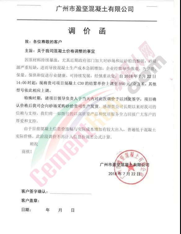 1、從2018年7月25日0點(diǎn)開始,全市所有混凝土企業(yè)所有標(biāo)號(hào)的混凝土銷售單價(jià)全部按照2018年第6期“深圳建設(shè)工程價(jià)格信息”公布的對(duì)應(yīng)等級(jí)預(yù)拌混凝土和濕拌砂漿單價(jià)作為最低銷售單價(jià);